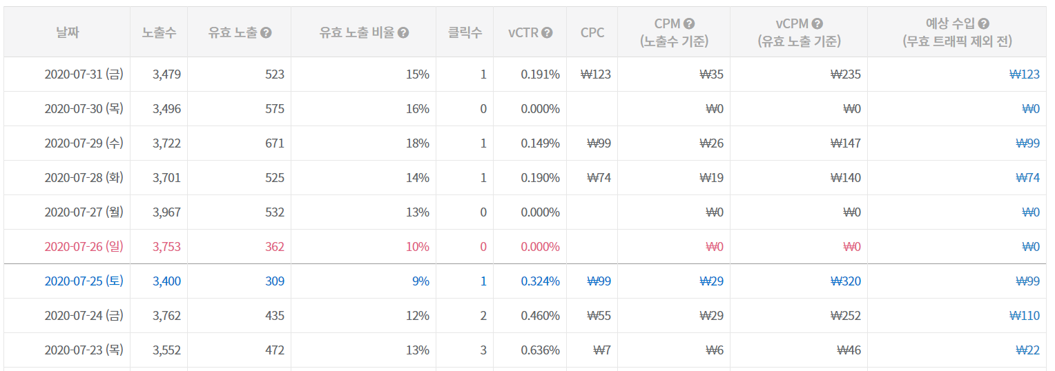 보시다시피 사이드바에 달아놓았던 데이블 클릭도 잘 안 생기고 달으나 마 나하 다는 걸 느끼고, 사이드바에서 제거했습니다. 이후 애드센스 일치하는 광고를 제거하고 데이블 광고 전용을 넣었는데 과연 수익이 나는지 저도 궁금하네요. 위 자료를 보면 1 클릭에 100대 정도 되는 것 같네요.
